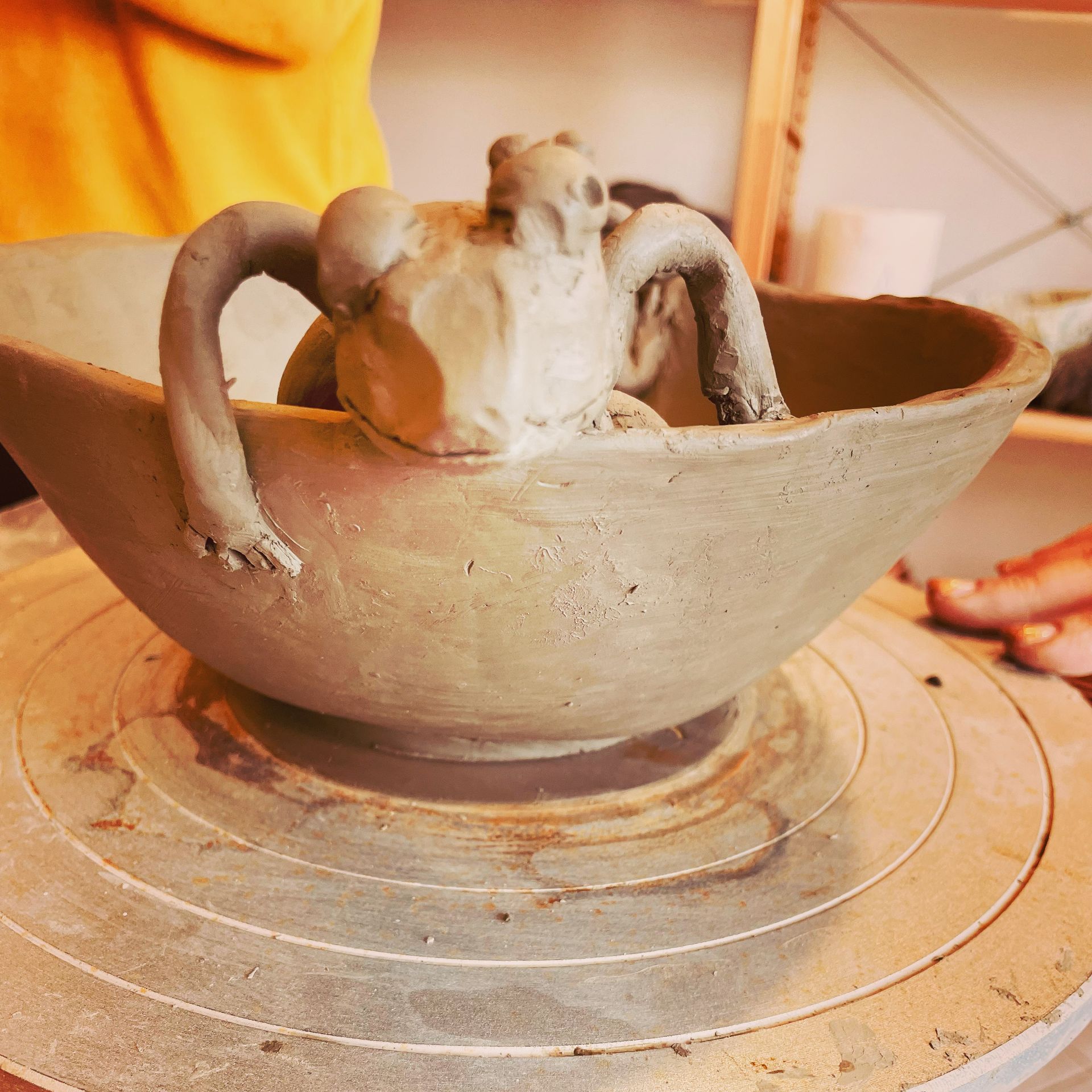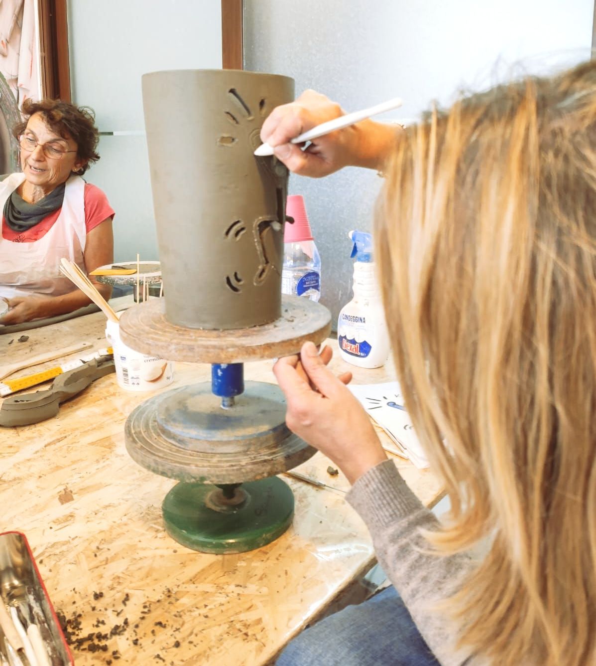 Sembra molto più comodo lavorare il nostro panetto di argilla direttamente sul tavolo da lavoro, ma a poco a poco mentre si lavora e si cerca di rendere equilibrato e simmetrico un oggetto ci si rende conto che è molto più semplice far girare l’oggetto su un asse piuttosto che continuare a muoverci noi.