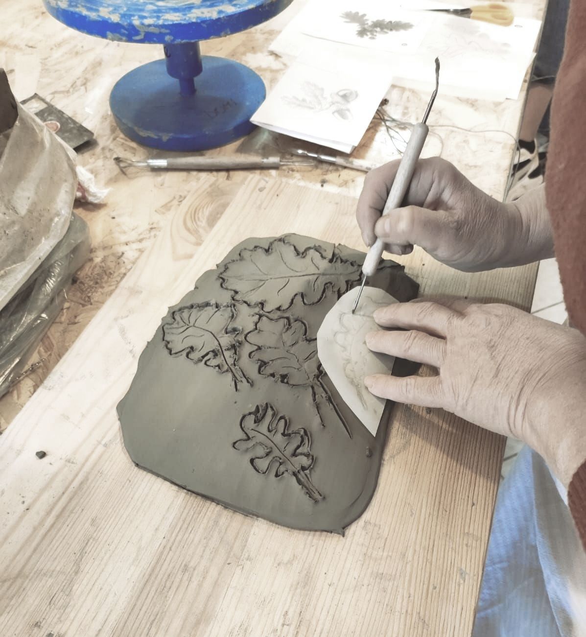 La lastra consiste in una superficie di argilla creata su una spianatoia di legno, lavorata con un matterello esattamente come una “sfoglia”.